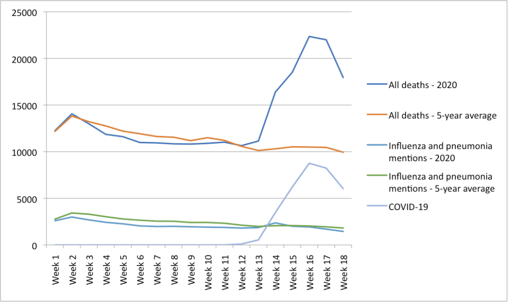 The proportion of excess deaths accounted for by Covid-19 continues to be in the range 70-75% so the proportion of excess deaths from unknown causes remains relatively small, this is good as early indications and evidence from other countries suggested this could be substantially larger.